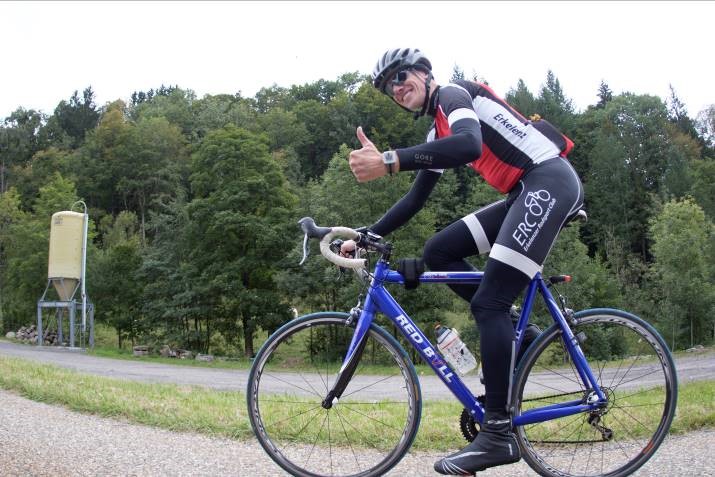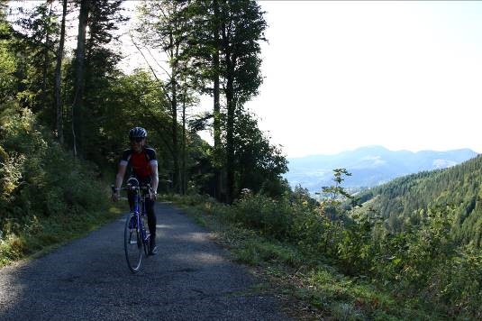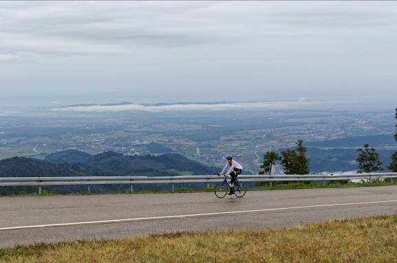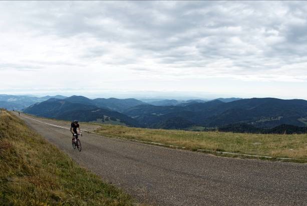 Und weiter ging die Reise. In welche Richtung war ja klar: wieder nach oben! Der Belchen (1414 m) stellte sich mit seinen 820 Höhenmetern nicht nur als zweitschwierigster Anstieg heraus, er sollte auch zum härtesten Teil der Tour für mich werden. Pünktlich am Fuss des Berges meldete sich trotz Nahrungsaufnahme wie ein Schaufelradbagger ein Hungerast an. Ja Danke!!! 11 Kilometer schleppte ich mich den Berg hinauf. Meine Fahrtlinie glich der eines Besoffenen. Jeder Streifenwagen hätte mich so auf der Straße aus dem Verkehr gezogen. Aber trotzdem kam ich irgendwie oben an. Nach dem Äsen durch das üppige Gipfelmenü eröffnete sich uns Fahrern ein grandioser Ausblick. Die Alpen, die Vogesen, das Rheintal…..alles lag uns bei Traum-Fernsicht zu Füßen. Viel Zeit zum Bewundern blieb aber nicht. Ab aufs Rad und wieder runter.