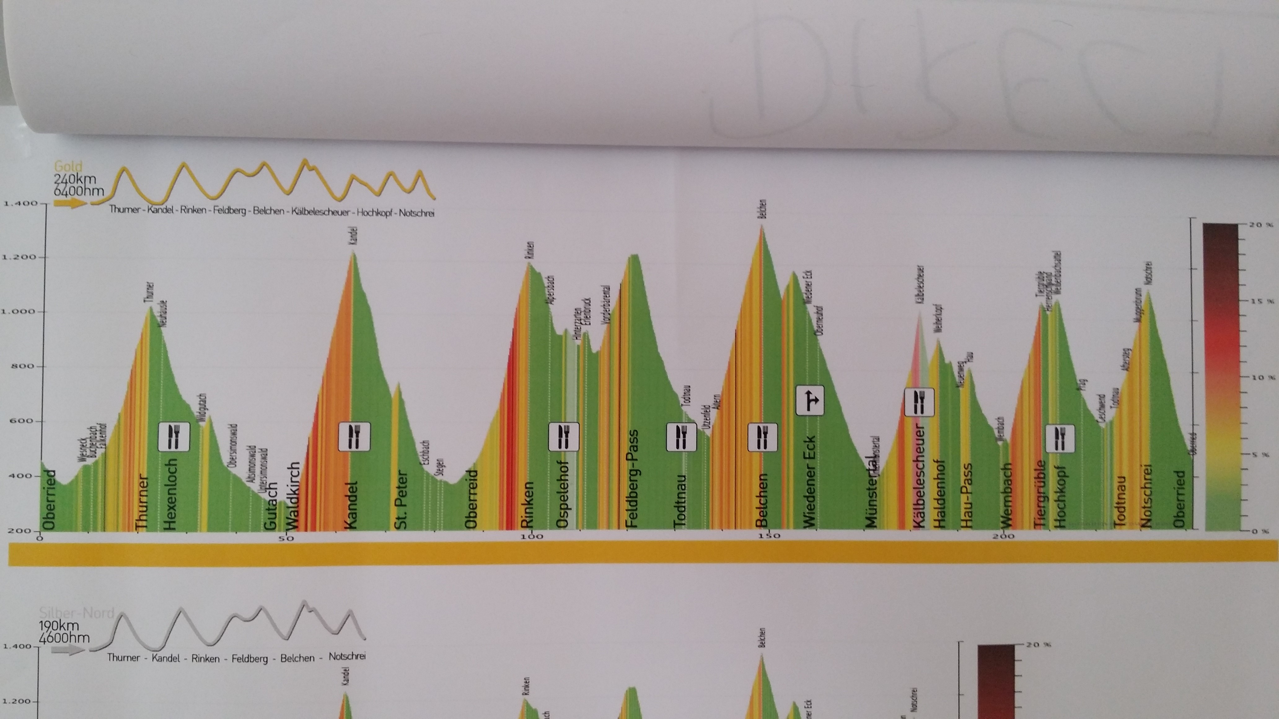 Vom Belchen konnte man nun entweder direkt in Richtung Ziel nach Oberried fahren, was sich dann Silber-Tour genannt hätte oder man bog auf die Südschleife zur Gold-Tour ab, welche weitere zwei kleine Schweinehunde zu bieten hatte. Ich wählte natürlich das Goldstück und begab mich bei mittlerweile stahlblauem Himmel und Sonnenschein auf die Südschleife. Die beiden zu bewältigenden Anstiege nannten sich Kälbelescheuer (1040 m) und Hochkopf (1079 m). Nie zuvor von gehört, aber mit zweimal 10 Kilometer Anstieg, je 700 Höhenmetern und bis zu 16% Steigungen gab man mir schnell zu verstehen, dass ich diese Wissenslücke bitter bereuen würde. Denn mit mittlerweile gut 200 km in den Knochen fuhren sich die Dinger irgendwie nicht mehr so locker.