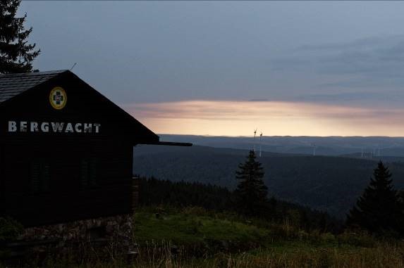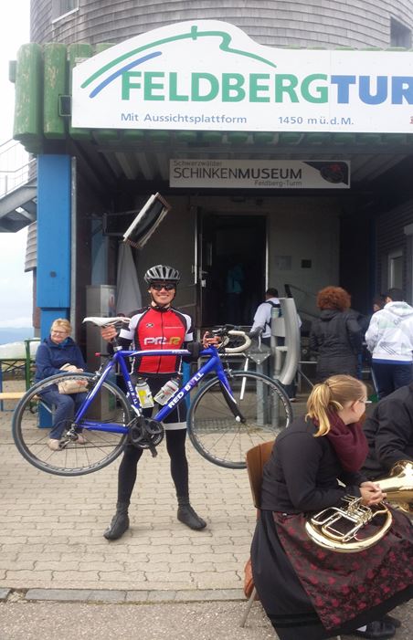Das änderte sich an Deutschlands höchster Erhebung außerhalb der Alpen, dem Feldberg (1493 m). Die am Titisee vorbeiführend Straße hinauf zum Feldbergpass glich eher einer Autobahn als einer Mittelgebirgsstraße. Hauptaufgabe war hier 9 ½ Kilometer im Sattel zu bleiben, wenn die rasenden Idioten in Zentimeter-Abstand an einem vorbeirauschten. Bis dorthin fühlte ich mich auch blendend, sodass ich die 400 Höhenmeter bis zur eigentlichen Passhöhe mit zusätzlichen 200 garnierte, indem ich mit zwei weiteren Bekloppten die optionale Sackgassen-Verlängerung bis zum Feldberg-Gipfel erklomm. Oben erwartete uns standesgemäß eine Blaskapelle, die zwar nicht für uns, sondern eine 2000 Jahre alte Rentner-Kombo trällerte, aber egal…….man begrüßte uns mit Klatschen.