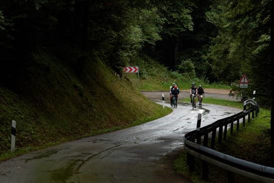 Einer rasanten Abfahrt in der Morgendämmerung in die malerisch enge Hexenloch-Schlucht folgte bei Kilometer 50 der nächste Anstieg. Das Miststück Kandel (1241 m) stellte sich als der schwerste/anspruchvollste Berg des gesamten Rennens heraus. Die folgenden 12 Kilometer schraubte sich die Straße steil mit 12-13% in den grauen Himmel. Insgesamt knapp 1000 Höhenmeter am Stück galt es zu bewältigen. Solche Anstiege hatte ich eigentlich nur in den Alpen erwartet. Zu allem Überdruß hatte es sich Petrus offensichtlich anders überlegt und wollte der Arche eine zweite Chance geben. Es goss in Strömen.